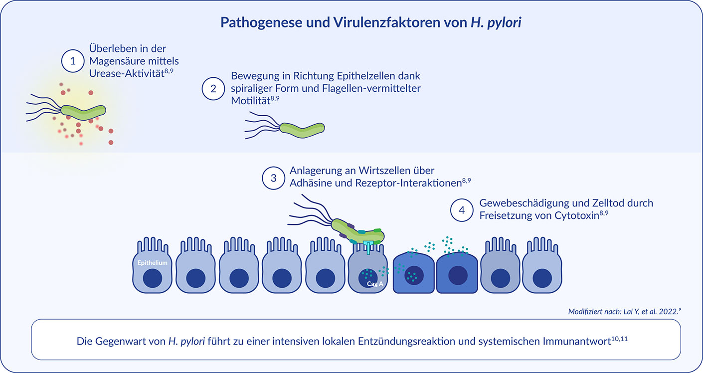 Nachdem H. pylori den Magen des Wirts erreicht hat, muss das Bakterium vier wichtige Schritte durchlaufen, damit es zu einer erfolgreichen Besiedelung und persistierenden Infektion und zum Auftreten einer Erkrankung kommen kann:8,9
