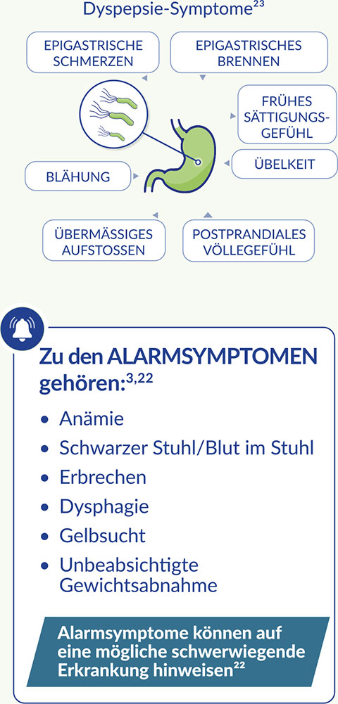 Symptome einer H. pylori-Infektion lassen sich in Alarmsymptome und Nicht Alarmsymptome einteilen3,22